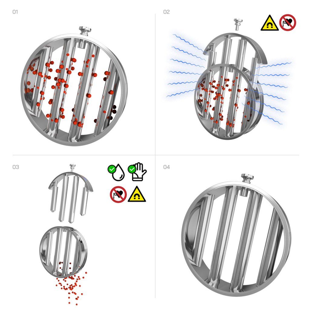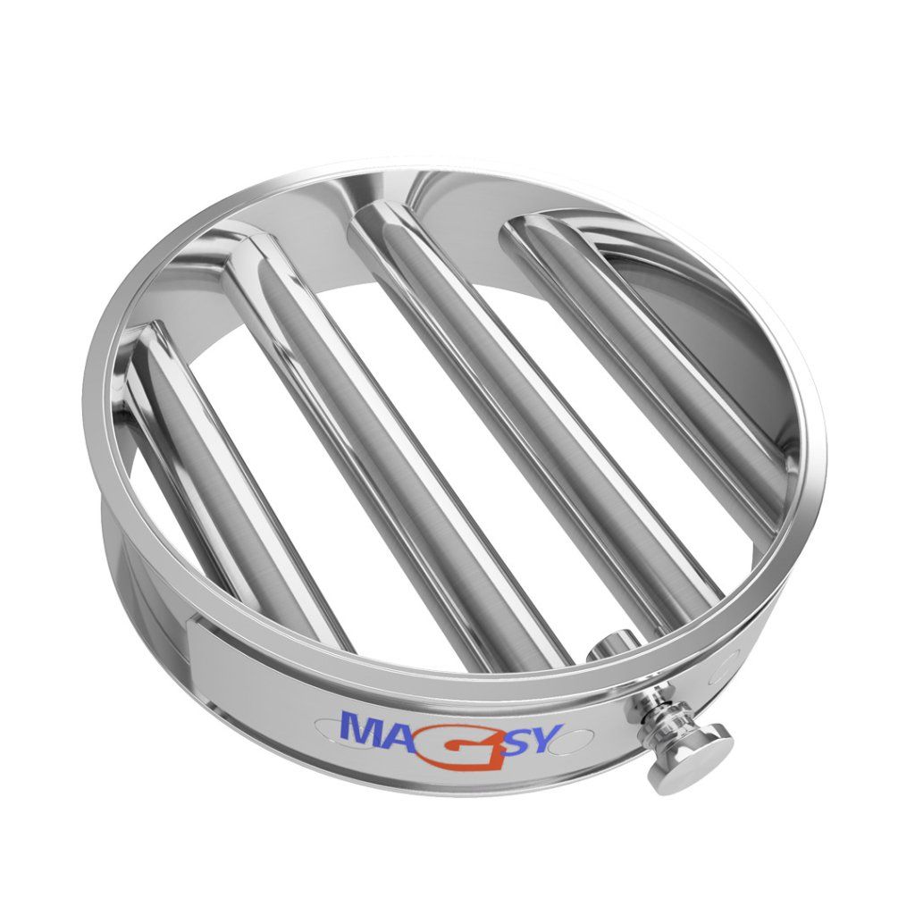 Magnetický rošt, určený výhradně pro průmyslové použití, zajistí dokonalé vyčištění vašich suchých směsí od feromagnetických nečistot (pojmem feromagnetické nečistoty myslíme plně magnetické kovy jako železo, nikl, kobalt a slitiny obsahující železo nikoliv paramagnetické, velmi jemně magnetické materiály).