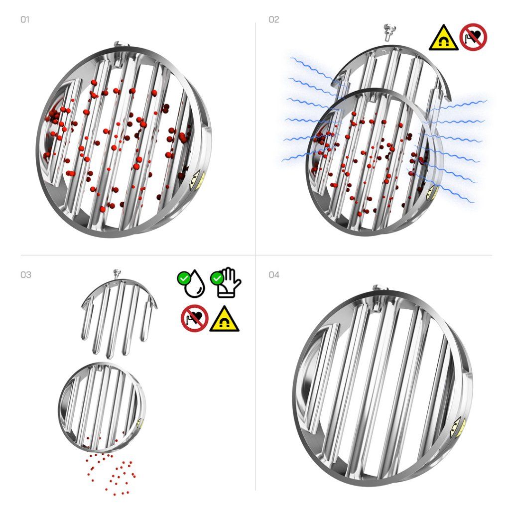 Při čištění magnetického roštu buďte velmi opatrní, magnetická jádra jsou velmi silná a jejich přichycením ke kovovým předmětům může dojít k poranění přiskřípnutím, tlakovým scvaknutím. Nepokládejte na nic magnetického (stoly, ponky, schodnice, podlahy…).