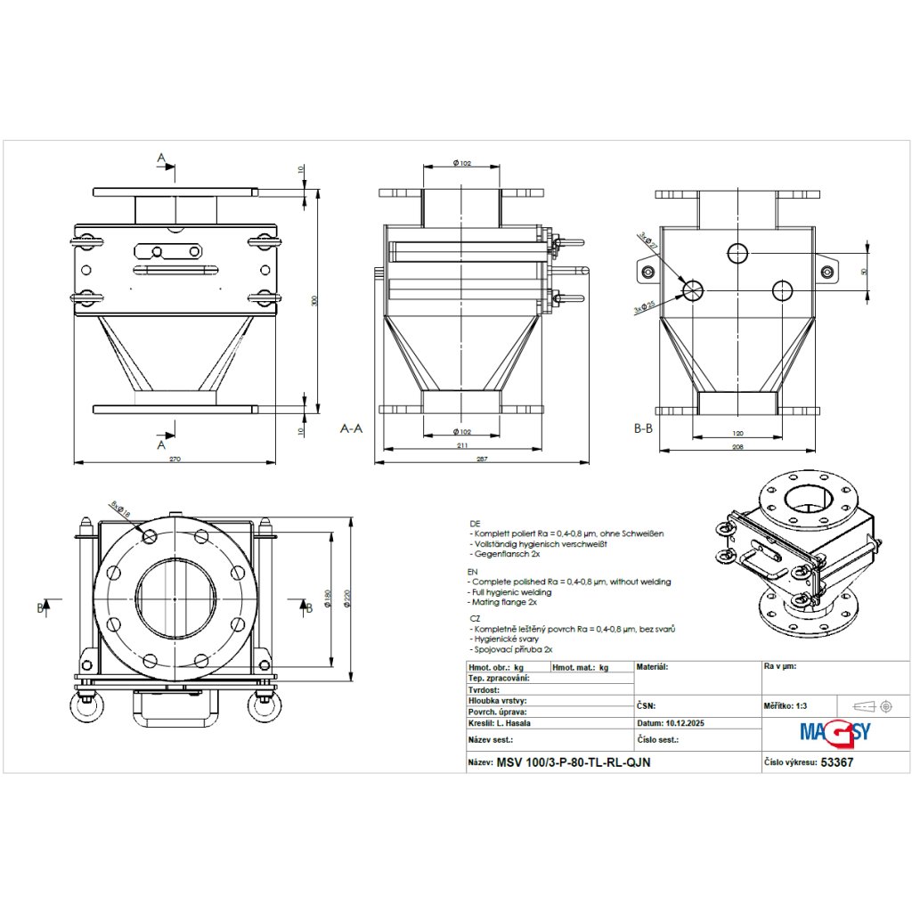| Materiál: | Nerezová ocel DIN 1.4301, EN 10088, ČSN 17240, AISI 304, AKV 7 – ocel chrom niklová austenitická nestabilizovaná (X5CrNi 18-10) |